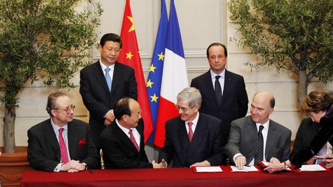 Cinquante contrats - symbole du cinquantenaire de la reconnaissance de la Chine communiste - seront signés au cours de cette visite dont une vingtaine, les plus importants, en présence des deux chefs d'État, au palais présidentiel. Parmi eux figure l'accord sur l'entrée au capital du groupe PSA Peugeot Citroën de l'État français et du constructeur automobile chinois Dongfeng qui a été formalisé. À Paris, Xi Jinping circulait d'ailleurs à bord d'une Citroën, l'une des marques du groupe. L'aéronautique mais également le nucléaire civil, l'agroalimentaire, la santé, les énergies renouvelables, l'automobile, les transports et le «développement urbain durable» font partie des secteurs à fort potentiel dans cette relation commerciale franco-chinoise marquée par un fort déficit de la France (26 milliards d'euros).